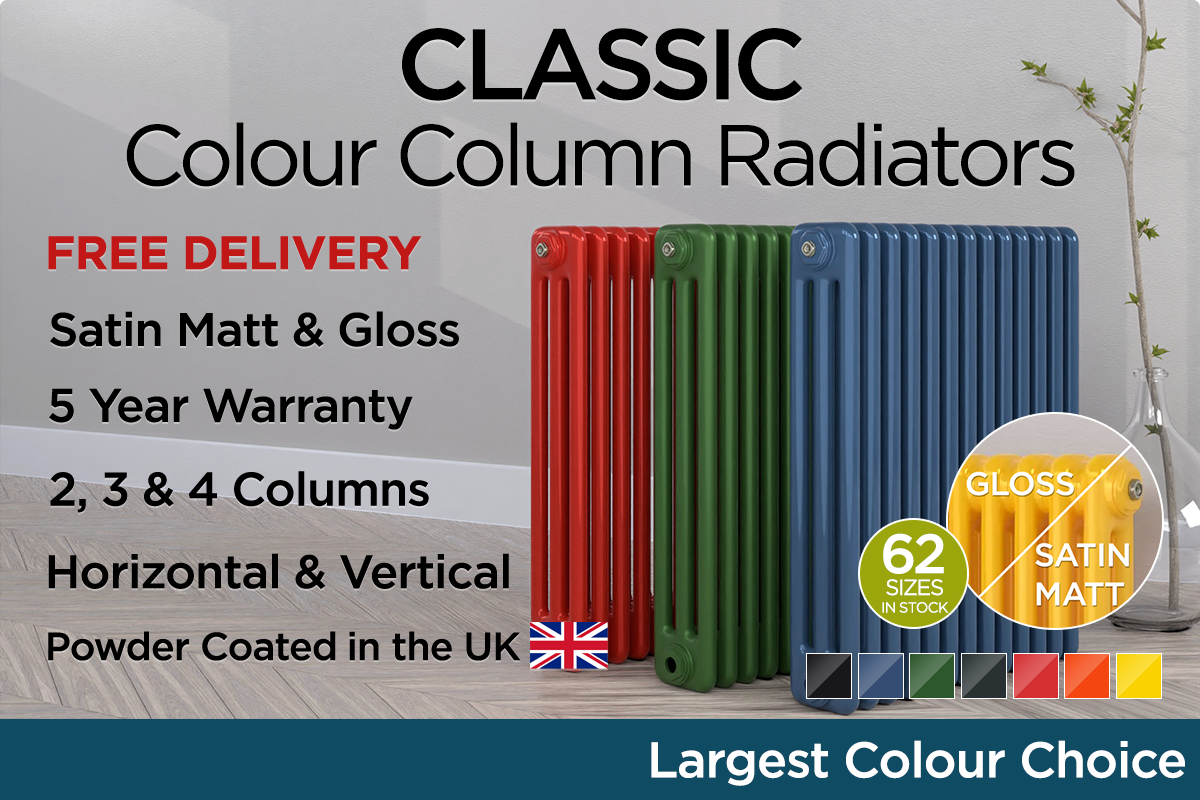 Discover the Classic Colour Column Radiators range — a collection of column‑style radiators available in a wide palette of 122 vibrant and neutral finishes. Whether you want to blend into a subtle décor or add a bold accent, there’s a finish to match your room’s style.